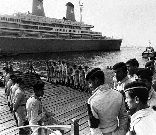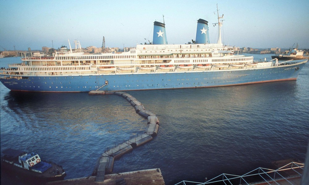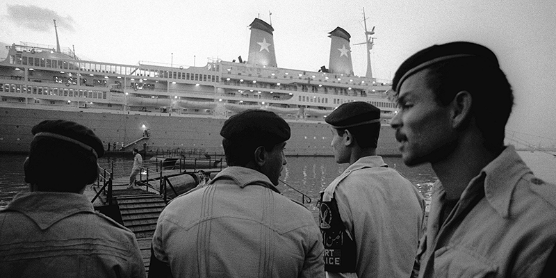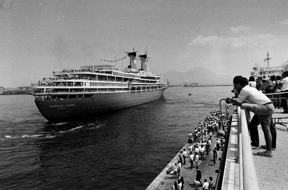 - Egyptian central security police guarding the gangplank on which diplomats and others go to and from the Italian cruise liner ?Achille Lauro? which arrived, Thursday, Oct. 10, 1985 in Port Said in this port after being hijacked by four Palestinian for more than 48-hours. The four hijackers has left Egypt after they surrendered go to the Egyptian authorities on Wednesday. (AP Photo)