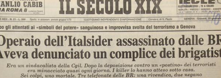 24 gennaio 1979 le Brigate Rosse uccidono un operaio e sindacalista italiano che lavora presso l’Italsider Guido Rossa (Cesiomaggiore, 1º dicembre 1934 – Genova, 24 gennaio 1979)